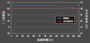 太陽光・湿度・雨など屋外の条件を人工的に再現し、接触角・光沢保持率の変化を比較。 ハイモース コート ジ・エッジは1800h(1年相当)でも試験当初から安定した接触角・光沢保持率を維持、非常に高い耐候性能であることがわかる。