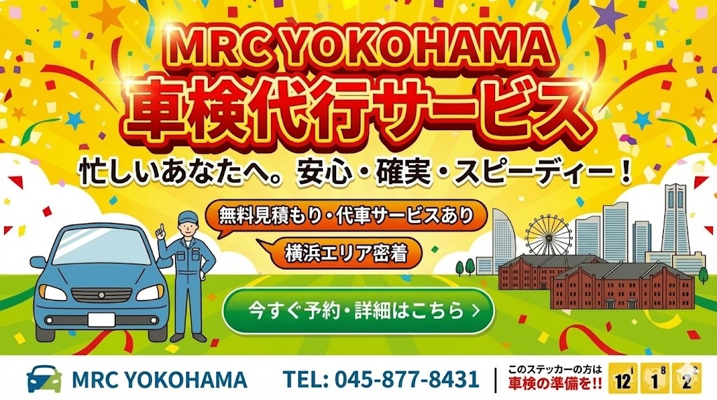 [et_pb_heading custom_margin=”||0px||false|false” title_level=”h4″ title_font=”Urbanist|700||on|||||” title_font_size=”14px” title_font_size_tablet=”14px” title_font_size_phone=”13px” title_font_size_last_edited=”on|desktop” title_letter_spacing=”0.2em” title_line_height=”1.6em” title=”MRC YOKOHAMA” _builder_version=”4.27.5″ _module_preset=”4db1bc52-bea3-4daf-bced-49292c34b8ce” title_text_color=”gcid-1f1b4e15-7cc6-4e13-8154-74d77a956460″ locked=”off” global_colors_info=”null” _i=”0″ _address=”2.0.0″ theme_builder_area=”post_content” /][et_pb_heading title_font=”–et_global_heading_font|600|||||||” title_font_size=”52px” title_font_size_tablet=”” title_font_size_phone=”34px” title_font_size_last_edited=”on|phone” title_line_height=”1.2em” title_level=”h2″ title=”車検代行がすごい” _builder_version=”4.27.5″ _module_preset=”3953ff7a-9900-4d76-95ce-0017fd37286f” global_colors_info=”%91%93″ _i=”1″ _address=”2.0.1″ theme_builder_area=”post_content” /]